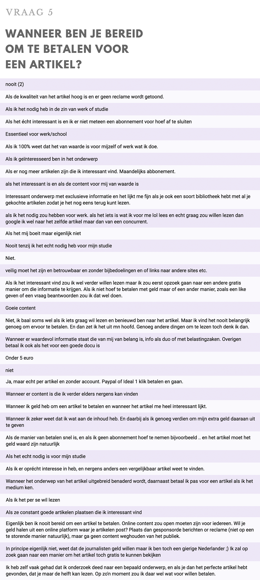 De enquête is ingevuld door in totaal 36 respondenten. Dit is een overzicht van alle binnengekomen antwoorden. Ik heb vanuit de antwoorden een aantal interessante conclusies kunnen trekken.